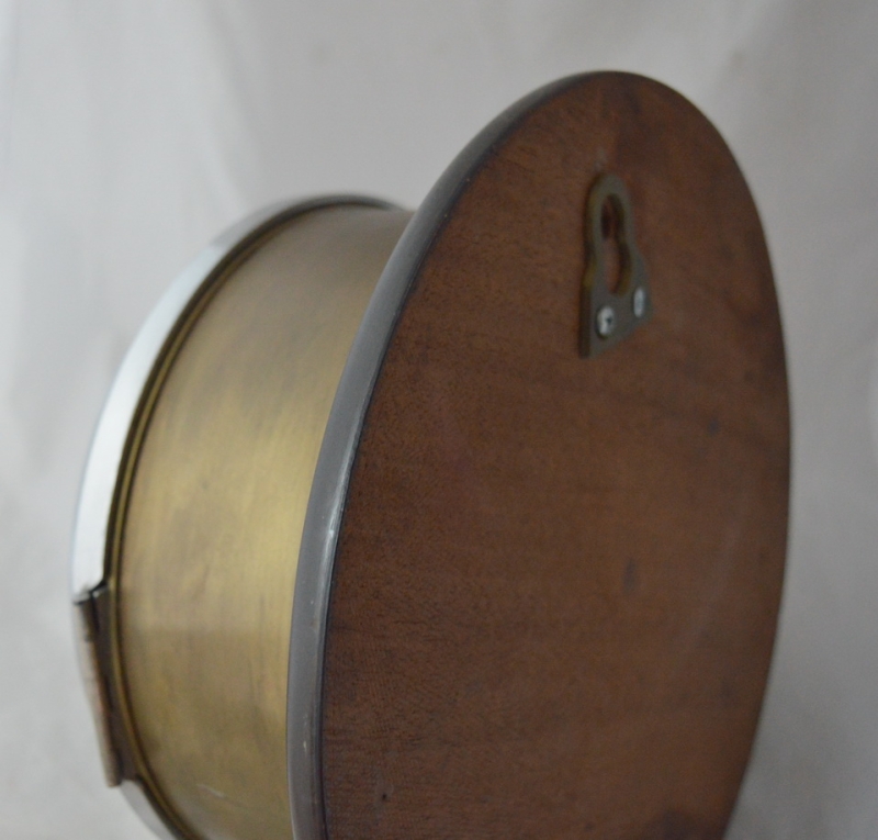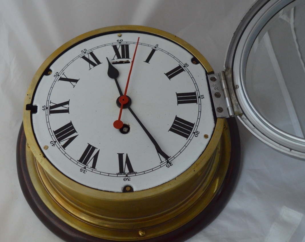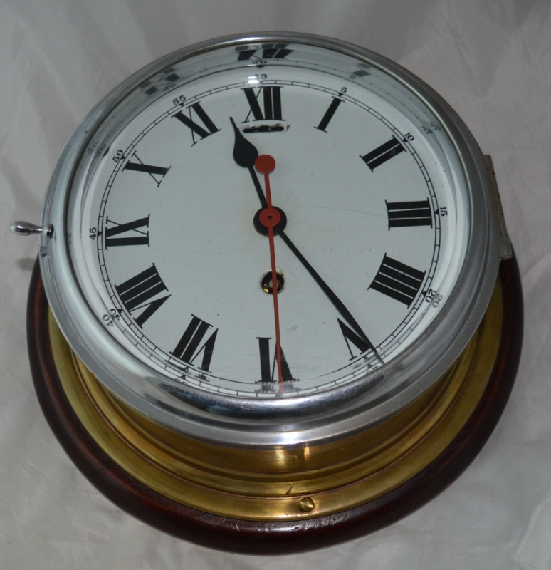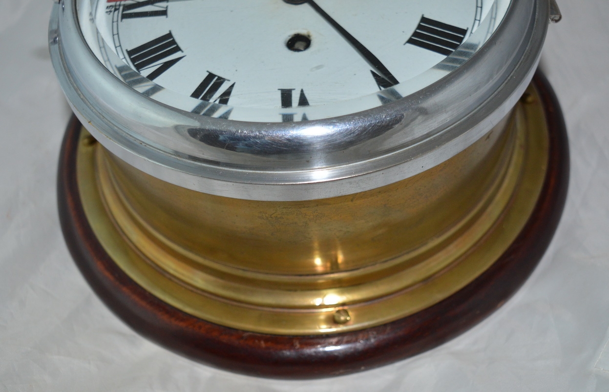 A brass cased ships clock with bevelled glass to the opening chromed front door. A higher quality 7" enamel dial with a slow/fast adjuster. A red sweep seconds hand. A mahogany circular backboard. An 8-day duration timepiece mechanism signed 'Coventry Astral'. Circa 1940.