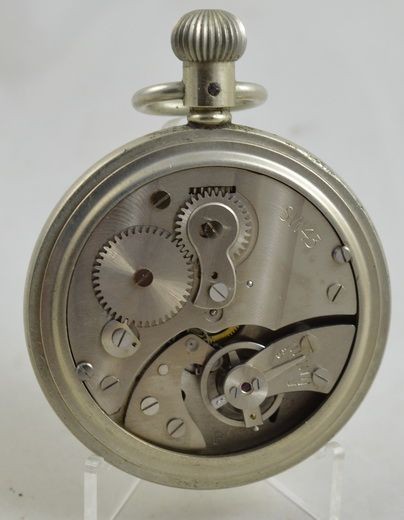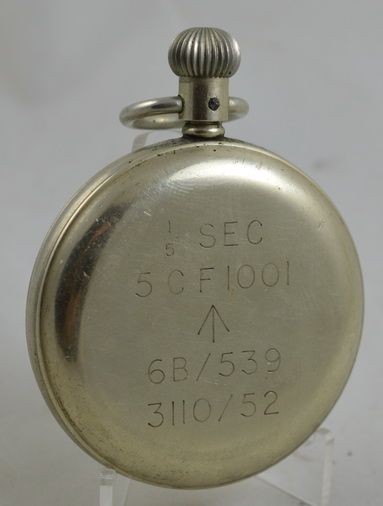 A British Military 60 second stopwatch by Smiths. An enamel dial with 1/5 second markers and a minute counter to 12 o'clock. Case back signed 6B/539 above 3110/52. Signed to the dial and the case back with the British Military broad arrow mark. Circa 1950.