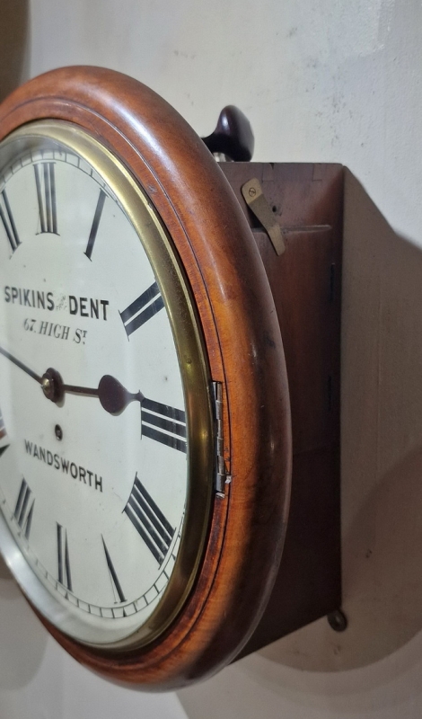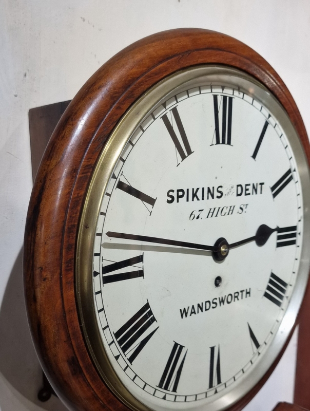 A Victorian fusee dial wall clock. A 12" painted dial signed 'Spikins from Dent 67, High St Wandsworth' with blued steel hands. A mahogany case case of with a brass bezel surround. An 8-day duration fusee timepiece mechanism. Circa 1870.