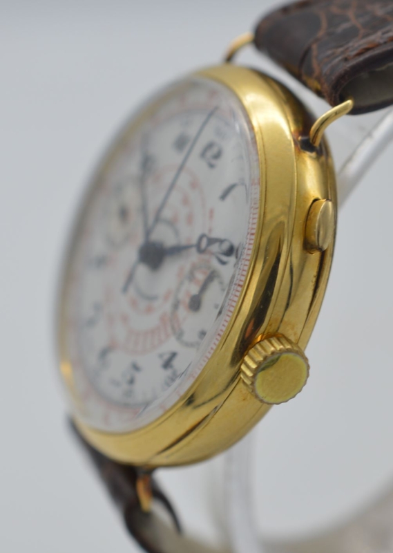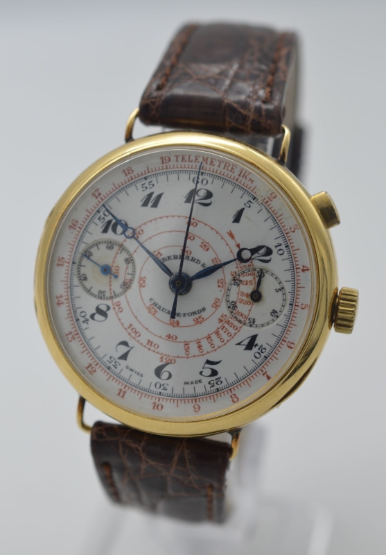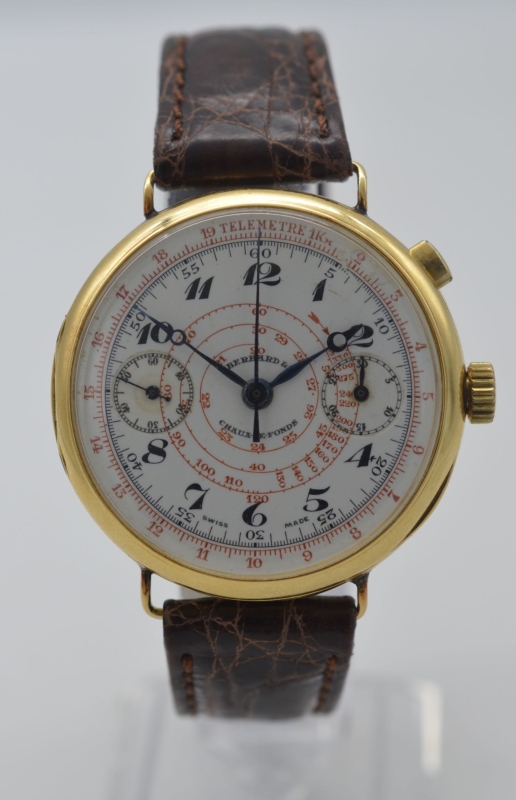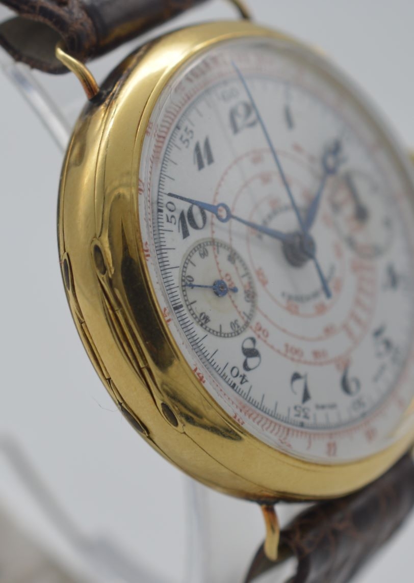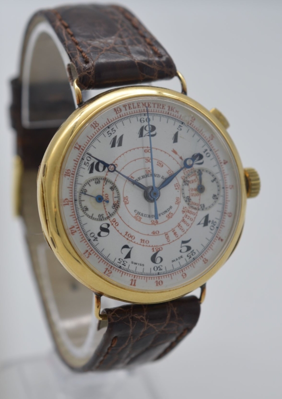An exceptional 1930's Eberhard & Co 18K gold, monopusher chronograph. An enamel dial with multiple scales and subsidiary dials. An outer Telemetre scale in a contrasting red finish surrounds the minute track, segmented with 5 minute markers. An inner snail 'pulsations' or 'chronoscape' scale. A 30 minute chronograph counter to 3 o'clock, opposite a constant subsidiary seconds dial to 9 o'clock. Blued steel 'moon' hands indicate the hours and minutes, with stylised Arabic numerals. Signed 'Swiss made' to the bottom.