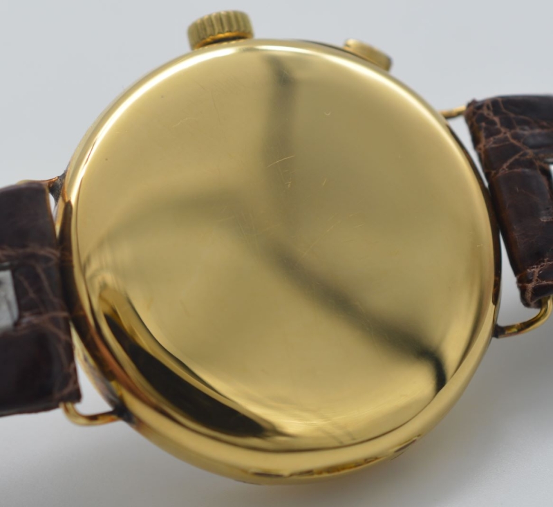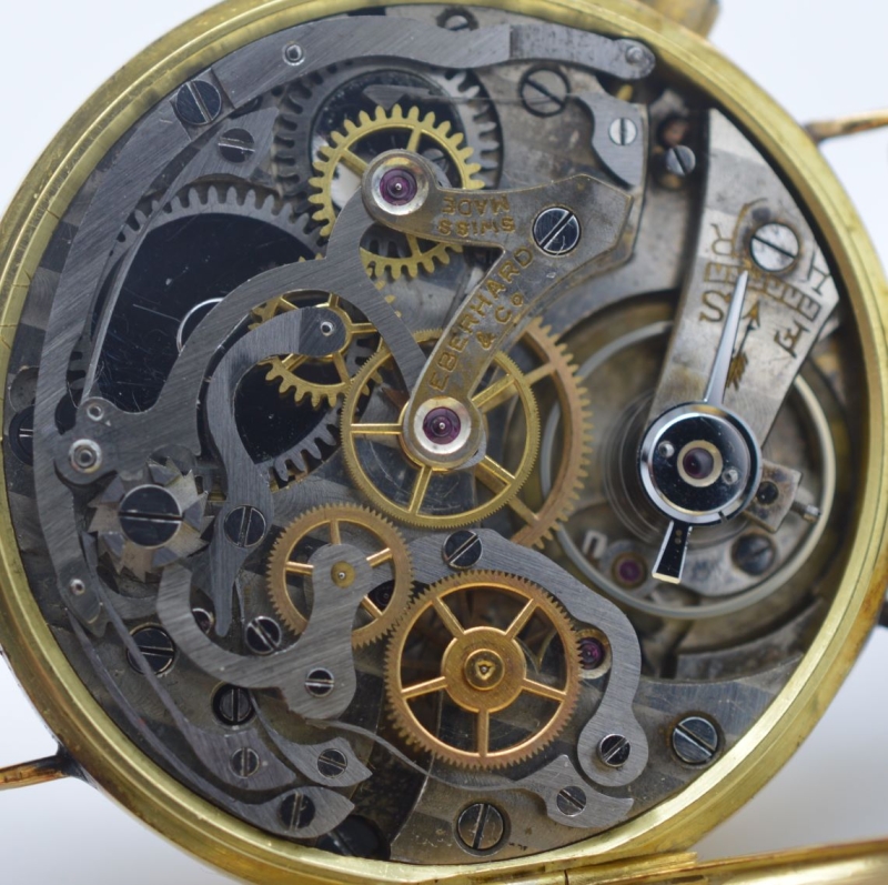 The watch is powered Eberhard 16000, based on the Valjoux 65. As one of the pioneers of early chronograph wristwatches, this was a base caliber they used in multiple wristwatches during this period. Circa 1930.