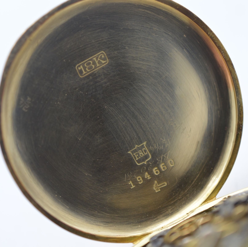 An oversized 18K gold case with hinged openings to the front and back. The case has fixed lugs, utilising a fold over strap. The body of the case is in excellent condition, with very few minor imperfections and retains its 'old gold' colouration, having been left untouched for a number of years. The inner case back is stamped 18K with a Swiss hammer poincon, as well as E&C. Inner case number 194660.