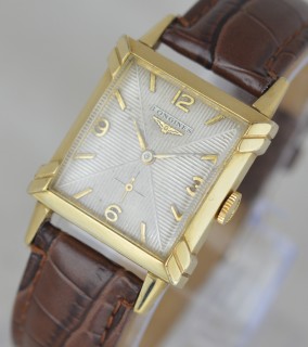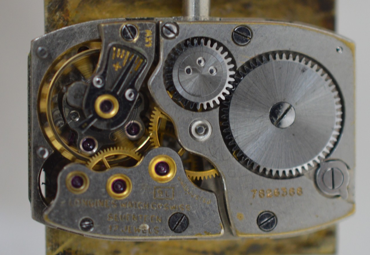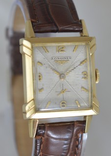 A 1949 Longines gold filled wristwatch. A 'tank' style case design with extended corners to the case and original winding crown. A quartered dial with ridged design. Arabic numerals to the quarters and batons to the rest. A high quality 17 jewel caliber 9L Longines Swiss made mechanism, marked LXW. Case inner marked Longines Wittnauer. Serial numbers date this watch to 1949.