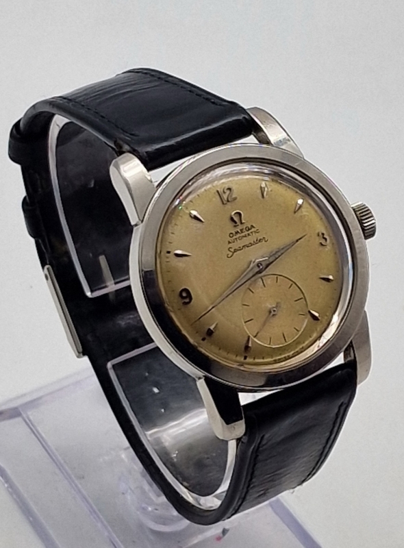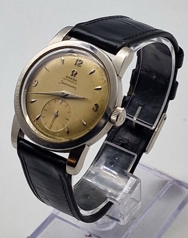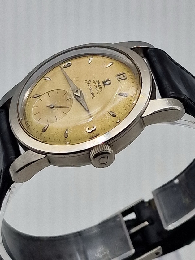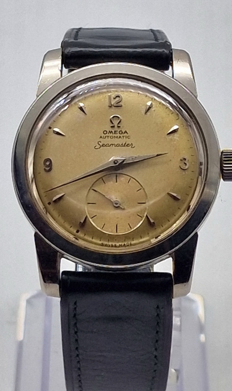 A 1950 Omega Seamaster Automatic 'bumper' wristwatch. A gilt patina dial with applied steel 'dagger' hour markers and Arabic quarters. The hours and minutes are indicated by steel 'Dauphine' hands. Applied Omega logo with the script with 'Automatic Seamaster'. Signed Swiss made' to 6 o'clock.