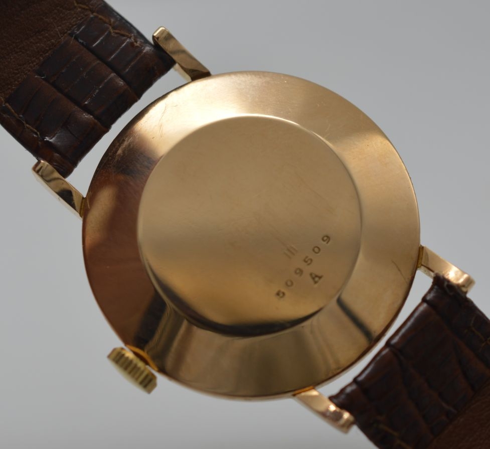 The case is of a larger design than most watches of this period, which alongside the case material makes this watch a rarity. A slim bezel design of the same proportions as the lugs - adding a stylish overall look. A snap on case back with a flat centre. Case back marked 509509 A. The case inner is marked with the Swiss marks including the key poincon (number 3) and the 4/10 mark, indicating the thickness of the case material.