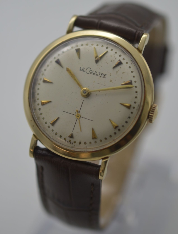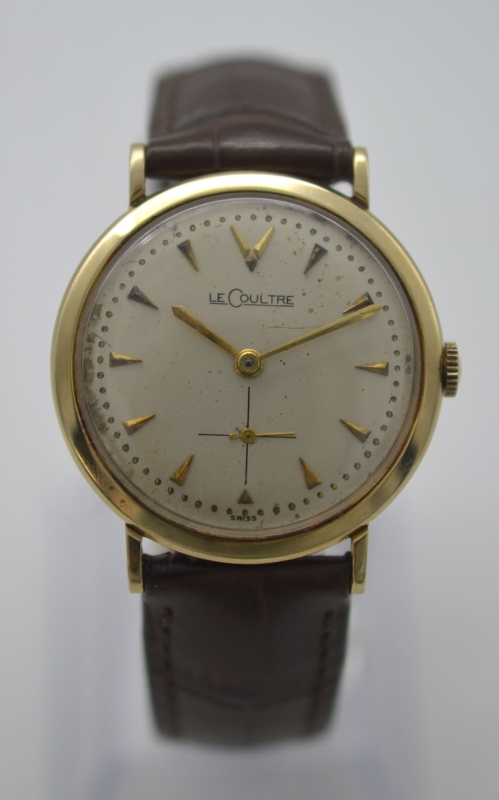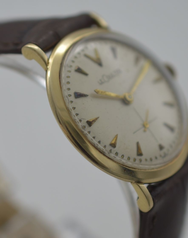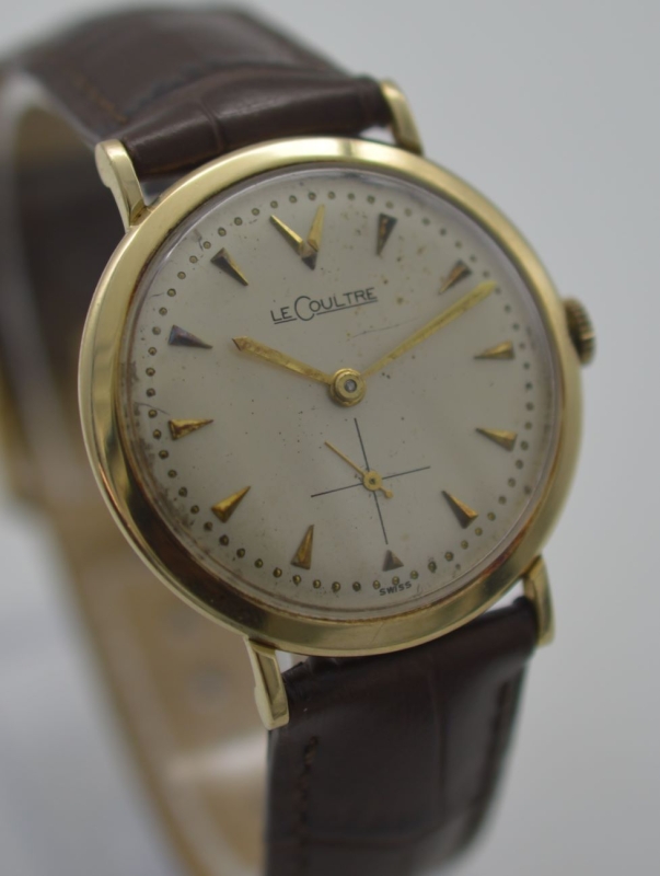A 1950s LeCoultre 14K gold wristwatch. A silvered dial with applied gilt numerals of a 'dagger' style. A large V shaped numeral at 12 o'clock. The dial is signed 'LeCoultre' below 12, with Swiss Made to the 6 o'clock. A subsidiary seconds dial of a crosshair design. Gilt 'Sword' hands indicate the time.