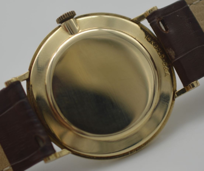 A slim, two piece case with a sloped bezel and a centrally domed case back. The case has narrow lugs, each with a scrolled end. The case is marked to the back 14K Gold D&A, indicating its production by DiVincenzo & Arienti, a New York Watch Case manufacturer responsible for casing many top end Swiss brands that were imported into the USA. Case reference 625-690.
