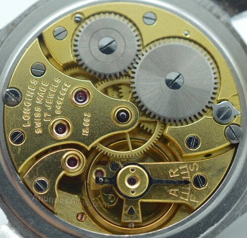 A stainless steel 3 piece case with a snap on case back. Case back inner marked 'Baume, Made in England' and 'Denisteel'. Baume were the official importers for Longines in Great Britain and primarily used Dennison for their cases - as one of the premier case makers of the period. Case back signed 13322 and 7564.