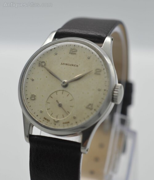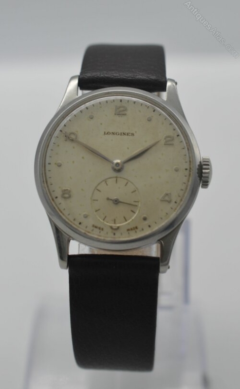 A 1951 Longines stainless steel cased wristwatch. A silvered dial with light patina. Applied steel Arabic numerals to the even numbers, with contrasting applied dots to the rest. Surrounded by an outer minute track. Steel 'feuille' hands. A subsidiary seconds dial to 6 o'clock, above 'Swiss made'.