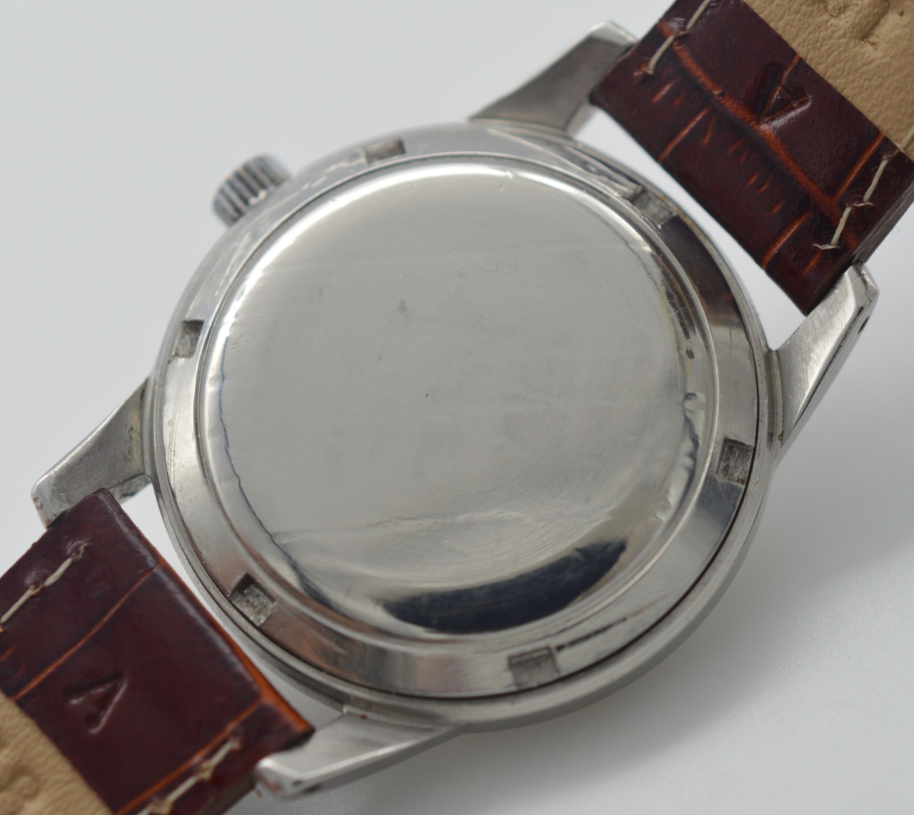 An oversized stainless steel case, often described as the 'beefy lug' variant. The central case body is one piece, with a flat bezel and step down lugs. A screw down case back. Case reference C 2557-3.