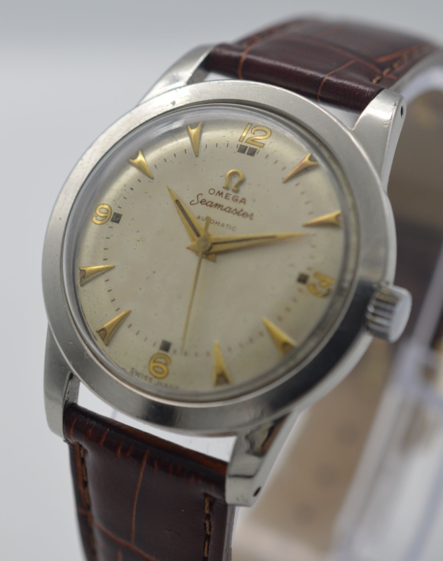 A 1951 Omega Seamaster automatic wristwatch. A silvered dial with two-tone finish, each reflecting at different angles. Applied gilt arrow markers, backed by lume dots in the recess. The quarters are indicated by Arabic numerals with a gilt reflective print, fronted by cushion accents. An inner printed minute track. The Omega logo is applied below 12 o'clock above the model script. This dial layout is one of the rarer variants of these models.