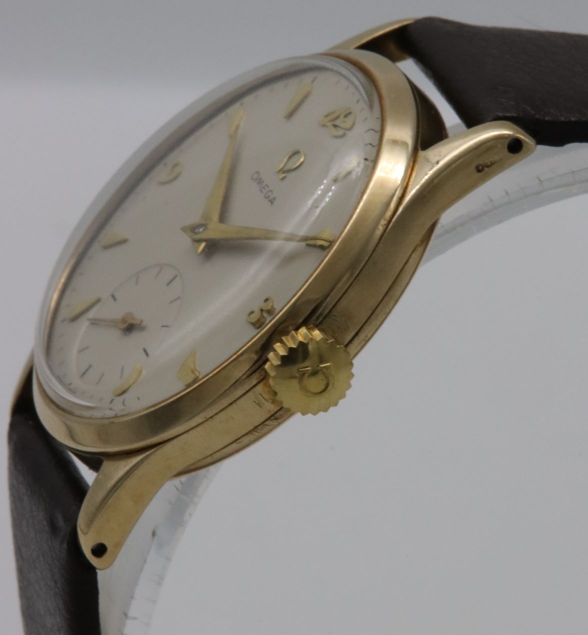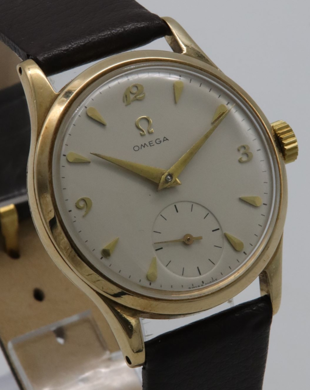 A 1952 Omega 9K gold wristwatch. A silvered dial, with applied gilt hour markers of an arrowhead style. The quarters are indicated by applied 'Breguet' style numerals. Signed Omega, below a gilt logo to 12 o'clock. A recessed subsidiary seconds dial to 6 o'clock. The hours and minutes are indicated by gilt 'dauphine' hands. Signed Swiss Made.