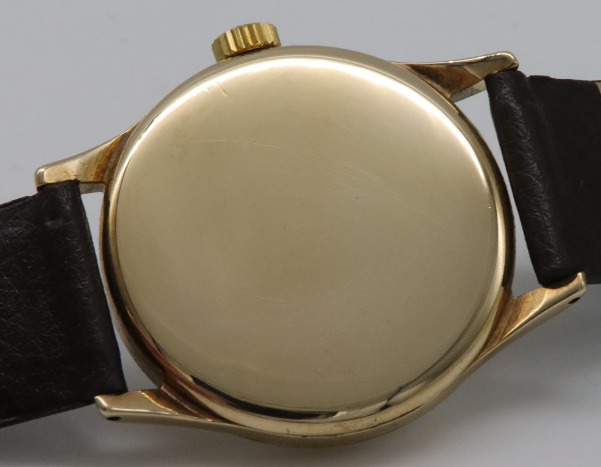 The watch is powered by a 17 jewel, manual wind Omega caliber 265 mechanism. Serial numbers date this watch to 1952.