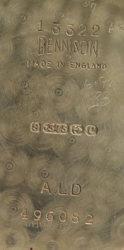 A solid 9K gold case, with well shaped lugs and a smooth bezel finish. The case is of a 3-piece style, with a central case body, a snap on bezel and back. An original Omega windiing crown. The inner is marked by the casemaker, Dennison and shows the reference 13322 as well as 'Made in England' and Birmingham hallmarks.