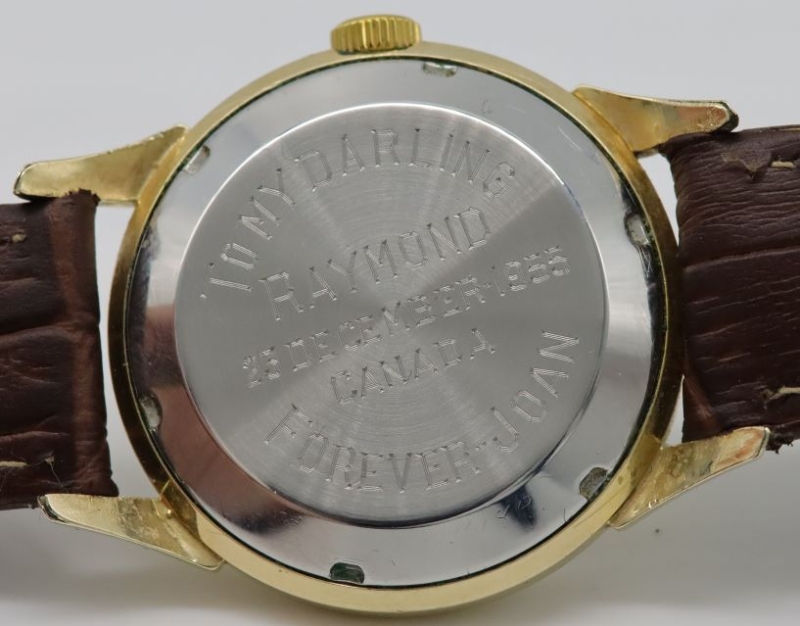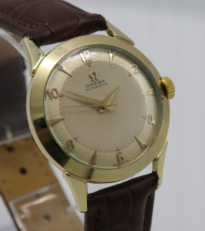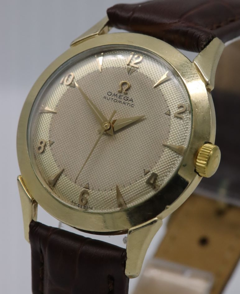 The watch is powered by a 17 jewel Omega caliber 354 'bumper' automatic mechanism. Serial numbers date this watch to 1954.