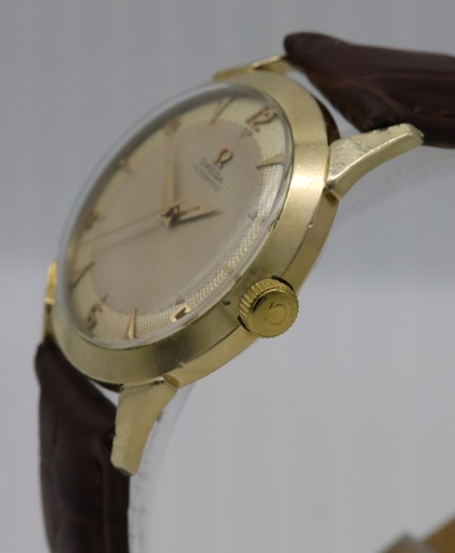 A 1954 Omega gold filled wristwatch. A rare two-tone dial, with a champagne 'honeycomb' effect. The outer ring of the dial is an excellent contrast to the slightly more matte centre. Applied gilt hour markers, alternating between Arabic numerals and arrowhead markers. The hours and minutes are indicated by lume filled 'dauphine' hands. An applied gilt Omega logo, with printed script belwo. Signed Swiss Made.