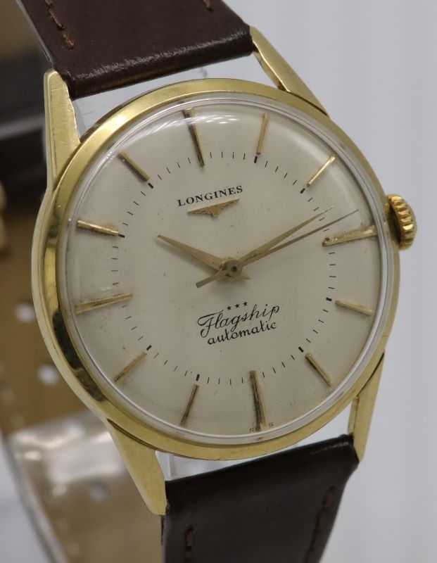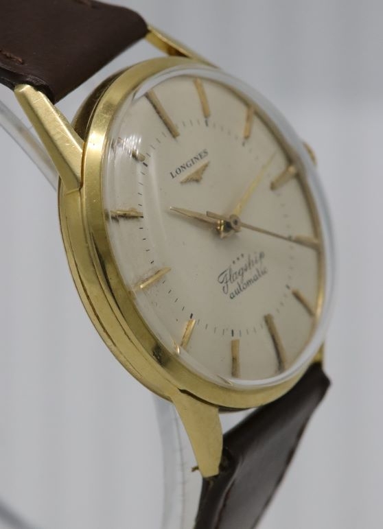 A 1959 Longines Flagship 'Big Ship' 18K gold wristwatch. A matte white dial with elongated hour markers, slightly larger at the quarters. An inner printed minute track with segmented 5 minute markers. An applied gilt Longines winged hourglass logo below 12, with printed script above. Signed to the lower section ''Flagship Automatic' with 3 stars.