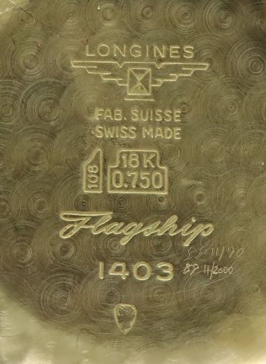 A solid 18K gold case, with elegantly tapered lugs showing champfered edges. The case overall is particularly well proportioned with a slim bezel and a flat case back. The standout feature of this watch is the case back, with a raised 'big ship' depicted - showing minimal signs of wear to the decoration. Original Longines winding crown. Signed to the inner 'Longines, Fab Suisse, Flagship' as well as a Swiss poincon 108. Case reference 1403.