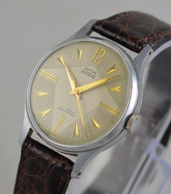 A 1960s Smiths Astral wristwatch. A rare dial with gilt hour markers and arrow markers. Gilt dauphine hands and a sweep seconds. A steel case with snap on case back. An English made caliber 27. CS Smiths 17 jewel mechanism marked 52. Circa 1960.