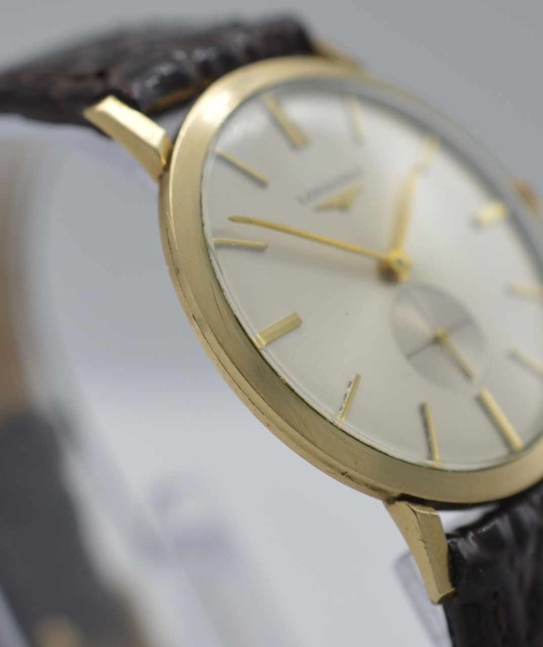 A 1965 Longines 9K gold wristwatch. A silvered dial with a sunburst finish. Applied gilt hour markers of a slim design, larger at the quarters. A subsidiary seconds dial with a central crosshair effect. An applied Longines logo below the script.