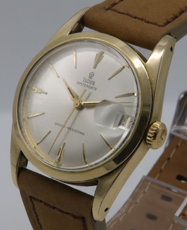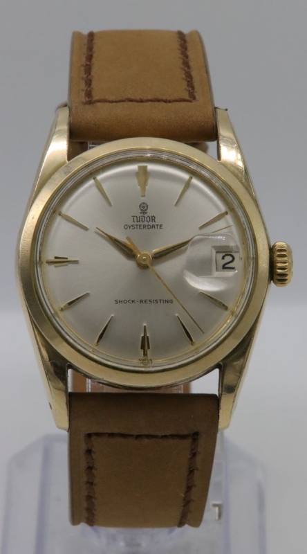 A 1965 Tudor Oysterdate wristwatch. A silvered dial with a sunburst effect. Elongated slim hour markers, with arrowed accents to the quarters. Signed below 12 o'clock with the Tudor Rose logo and with model script 'Oysterdate'. A date aperture to 3 o'clock, viewed through a cyclops lens. Signed Swiss Made to 6 o'clock.