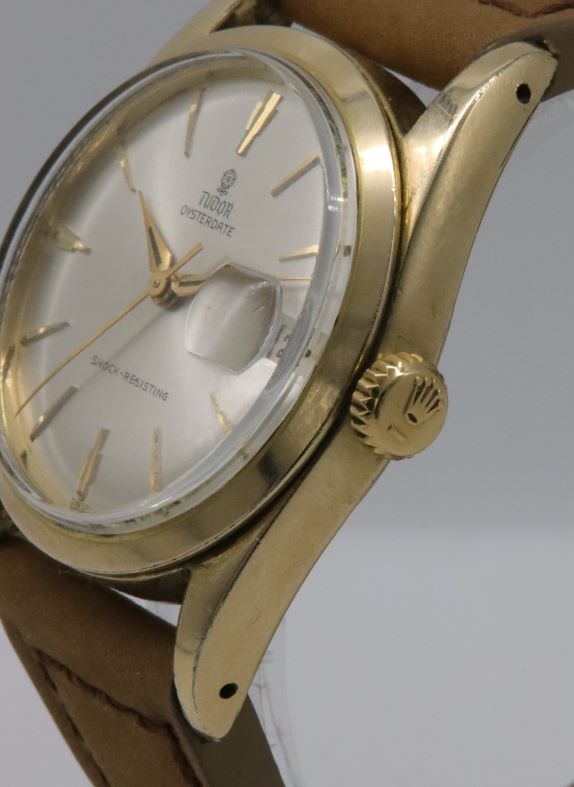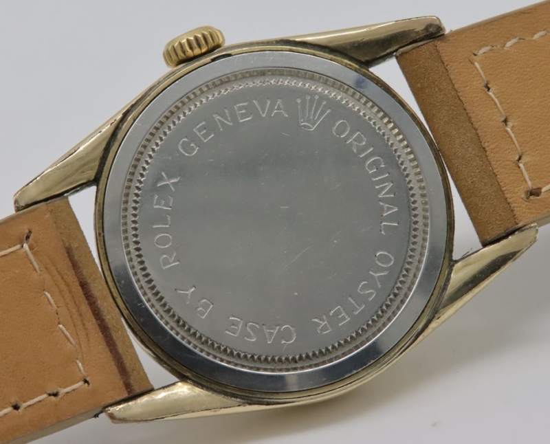 A larger gold capped case of a classic Oyster design, with sloped lugs and a smooth bezel. Original Rolex screw down crown. A stainless steel case back signed 'Original Oyster Case By Rolex Geneva'. Case referemce 7974.