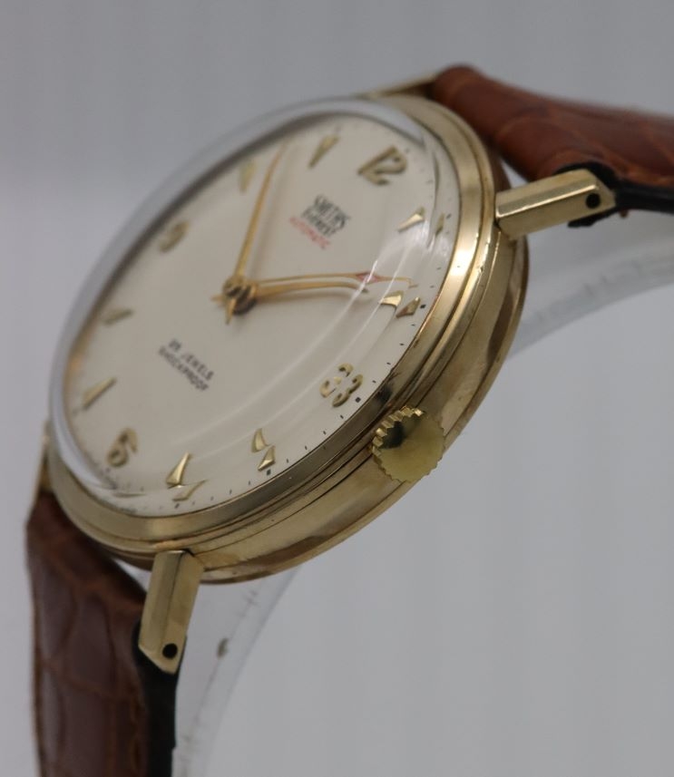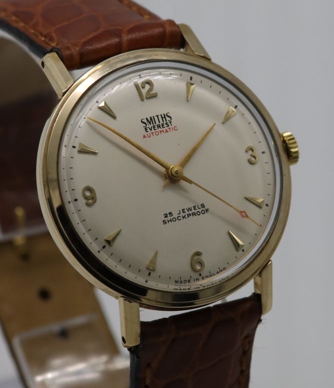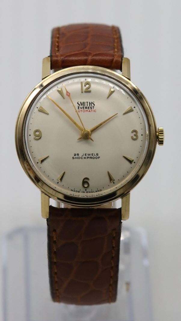 A 1966 Smiths Everest Automatic 9K gold wristwatch, full set. A remarkable find, this watch comes complete with its original inner and outer box, paperwork and is even accompanied by what is likely its original leather strap. A matte white dial with faceted 'arrowhead' hour markers and Arabic numerals to the quarters. Signed to the dial 'Smiths Everest Automatic' and 'made in England' to 6 o'clock. The hours and minutes are indicated by gilt hands, along with the classic Smiths signature of a red tipped seconds hand.