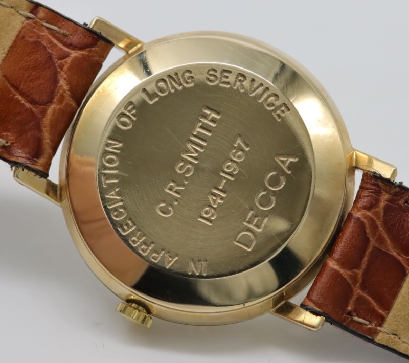 A solid 9K gold case with slim lugs, champfered to the edges which still retains its their sharp edging. A fairly deep case body, with a snap on case back showing a long service award for 1967. The case bears the makers mark of SCW for Smiths Clocks and Watches, as well as an Edinburgh gold hallmark for 1966.