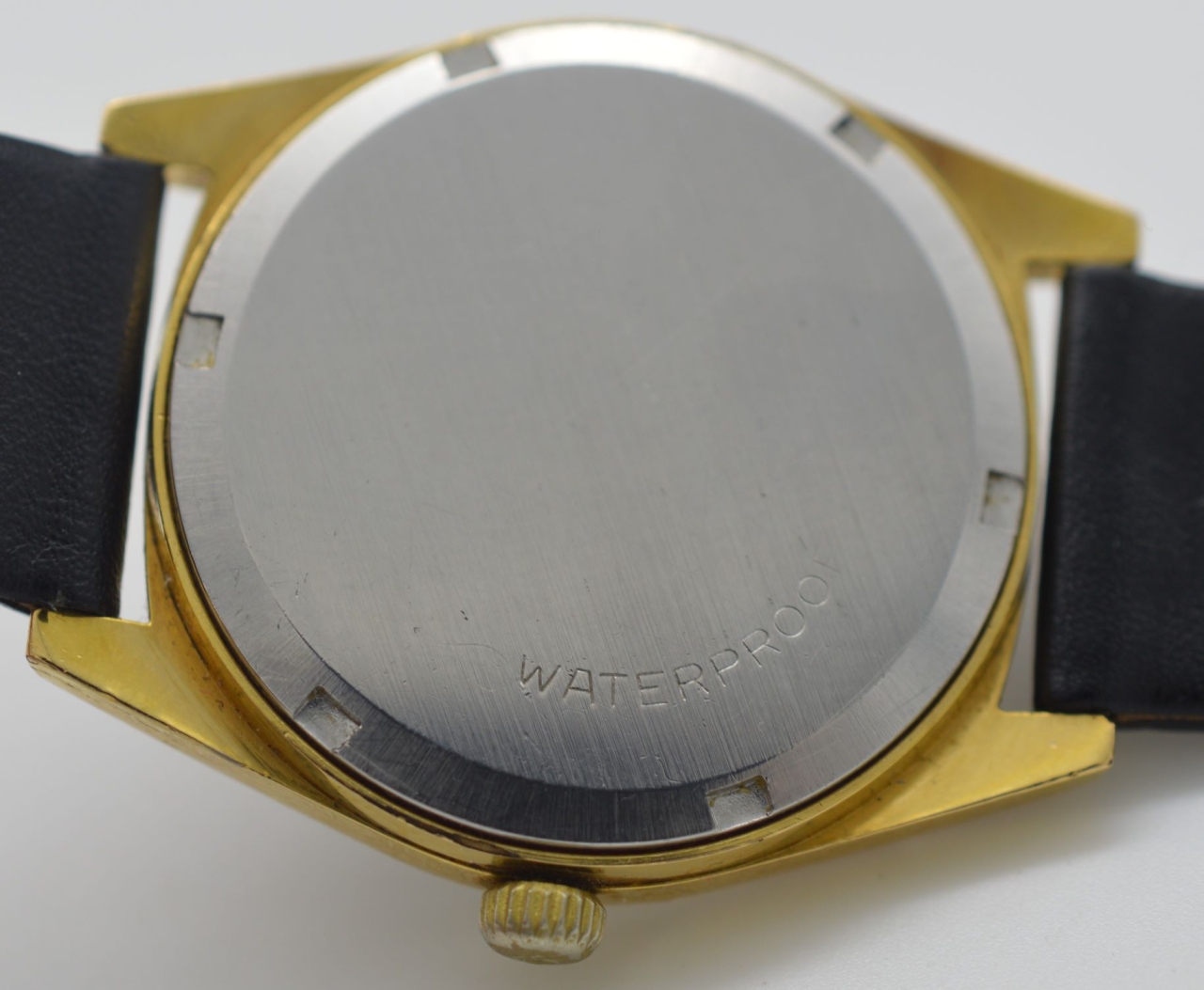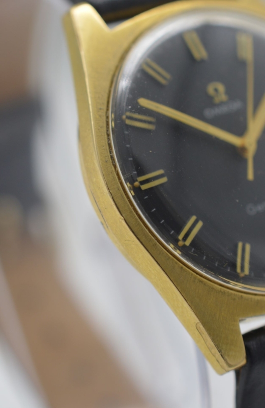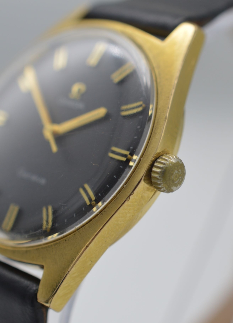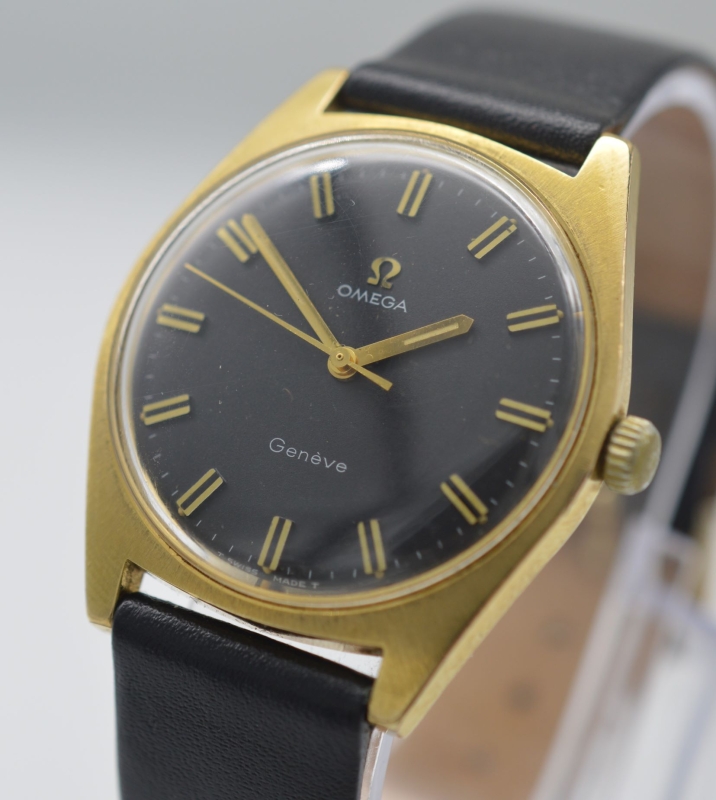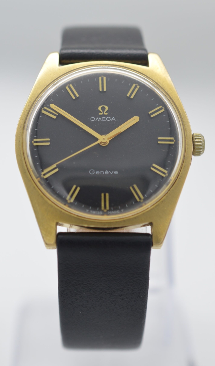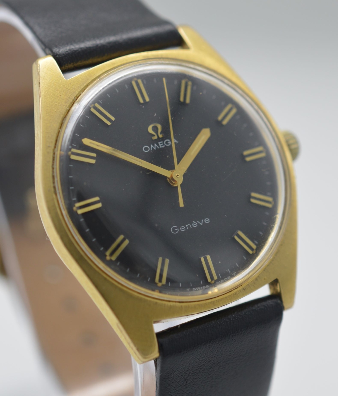 A 1968 Omega Geneve manual wind wristwatch. A rare black dial, with a matte effect finish. Applied gilt hour markers, each with a central black strip. The hours and minutes are indicated by gilt 'baton' hands. Applied Omega logo with the script in a contrasting white finish. Signed Swiss made' to 6 o'clock.