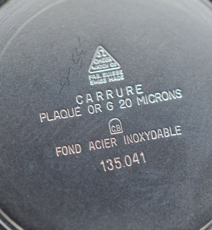 A Gold plated case with the original brushed finish surrounding the dial. An Omega winding crown. Original Omega 'glass' with logo to the centre. A stainless steel screw down case back. Case reference 135.041.