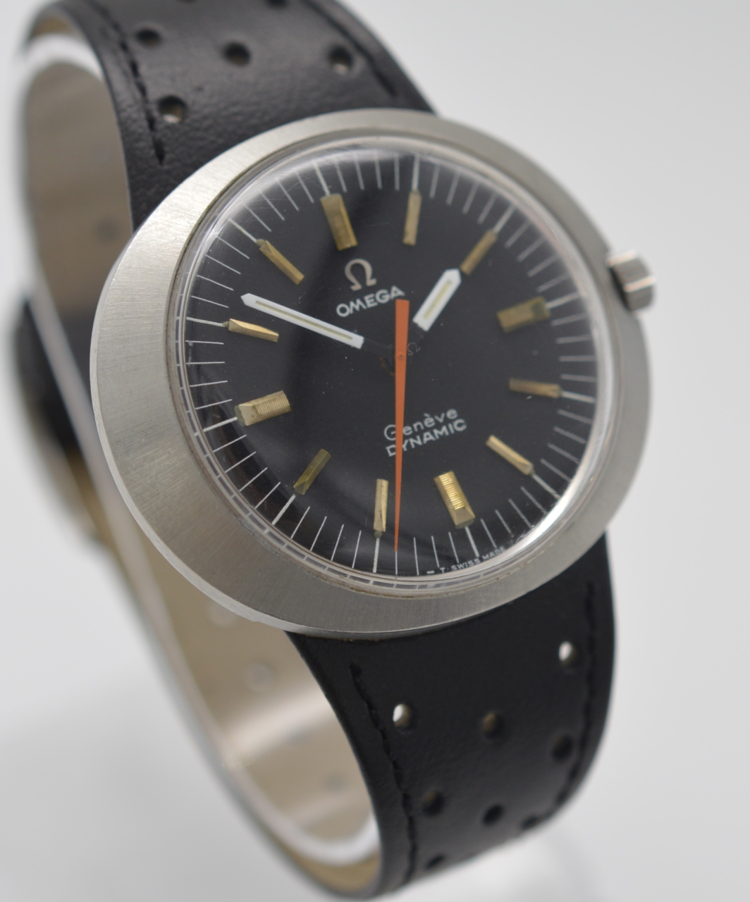 A 1969 Omega Geneve Dynamic wristwatch. A rare black dial with a powdered matte effect finish. Applied gilt batons with textured finish to the quarters. A large stainless steel case with original Omega winding crown and original Omega glass. A 17 jewel caliber 601 Omega mechanism. Case reference 135.033. The watch has the standard Dynamic case references stamped. Complete with a later Omega signed strap. Serial numbers date this watch to 1969.