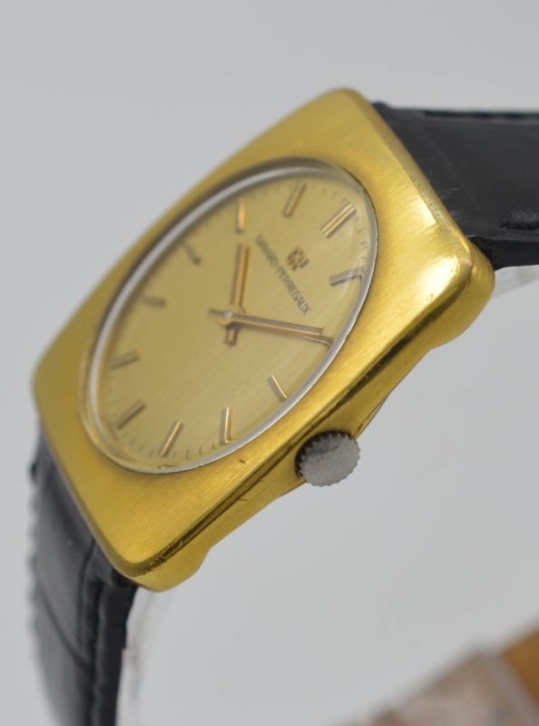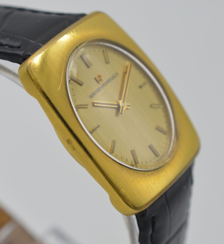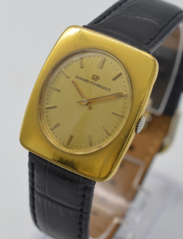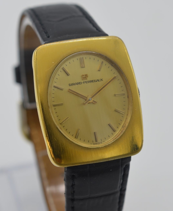 A 1970s Girard-Perregaux gold plated wristwatch. A gilt dial with a brushed finish, matching that of the case. Applied gilt hour markers, doubled at 12. The dial is surrounded by a thin minute track. Applied GP logo above the Girard-Perregaux script. The hours and minutes are indicated by thin gilt stick hands.
