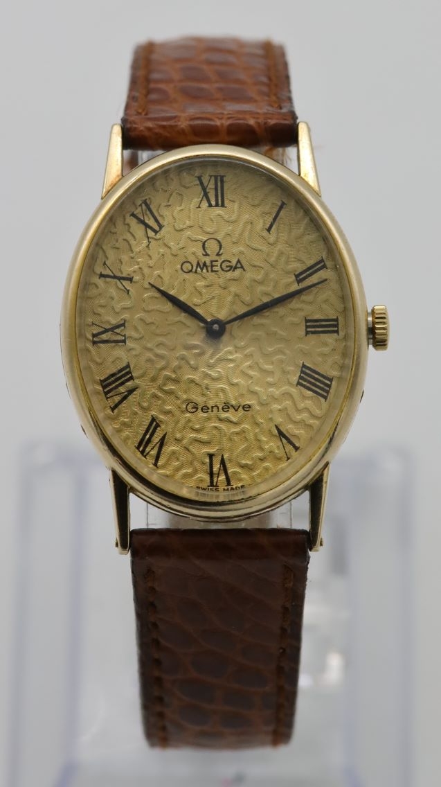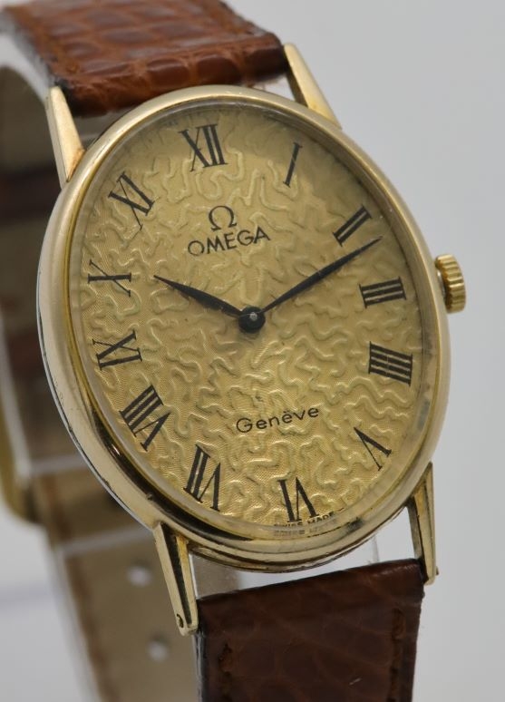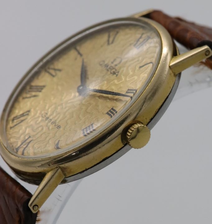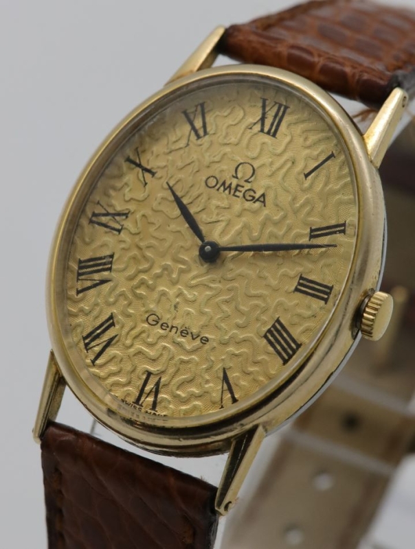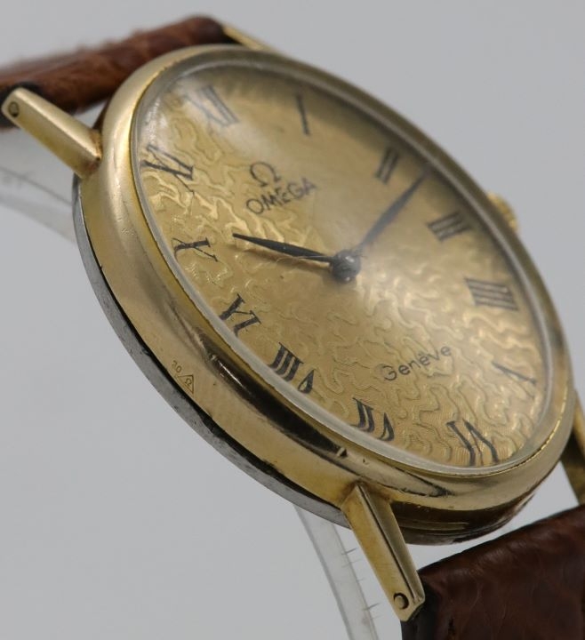 A 1971 Omega Geneve wristwatch. An unusual dial, with highly detailed engraving throughout. The raised sections of the engraving are polished and the recesses are brushed, with lovely detailing. Printed Roman numerals and Omega Geneve script.
