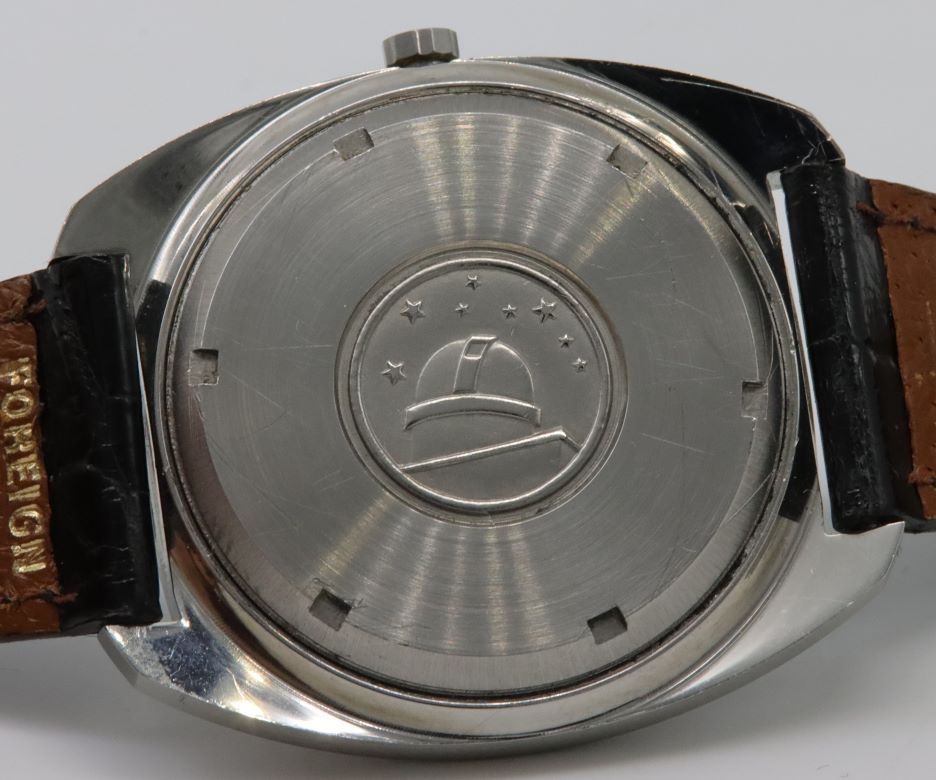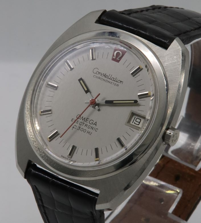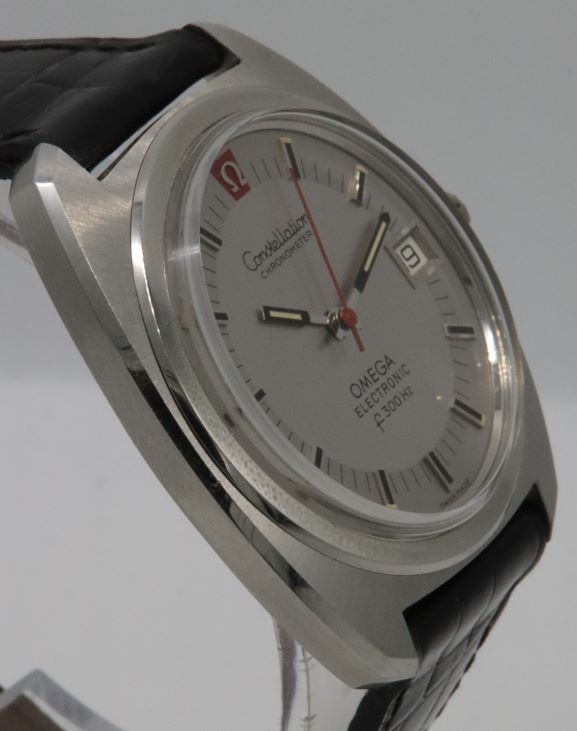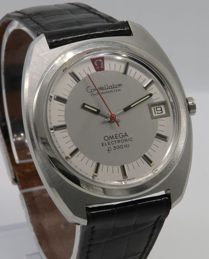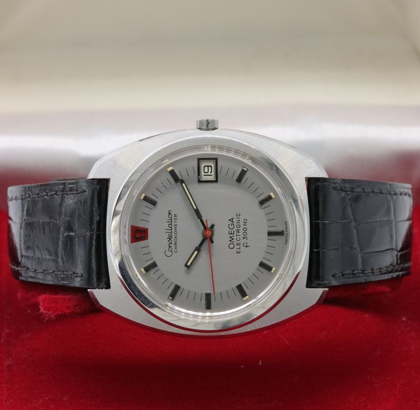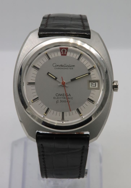 A 1972 Omega Constellation Chronometer f300hz. A two tone dial with a high shine silvered centre and a matte outer ring. Applied steel hour markers, each backed by lume caps. Elongated printed minute markers and script for 'Constellation Chronometer' and model script to the bottom half of the dial. The 12 numeral is shown as the red backed Omega logo, used for the electronic models of this period. A date aperture to 3 o'clock. Original Omega perspex crystal.