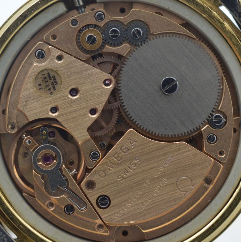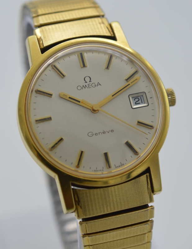 A 1974 Omega Geneve wristwatch. A silvered dial with a light brushed finish. Applied gilt baton hour markers, each with a central black strip. A printed outer minute track. A recessed date aperture to 3 o'clock. A printed Omega logo below 12 o'clock, along with the model designation below. Signed Swiss made below 6 o'clock. The hours and minutes are indicated by variants of 'pencil' hands, each with two colour lume filling.