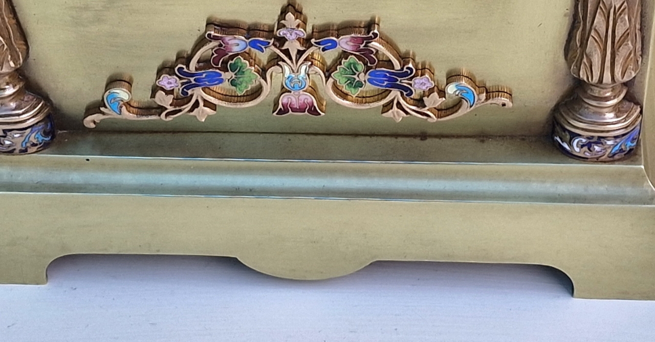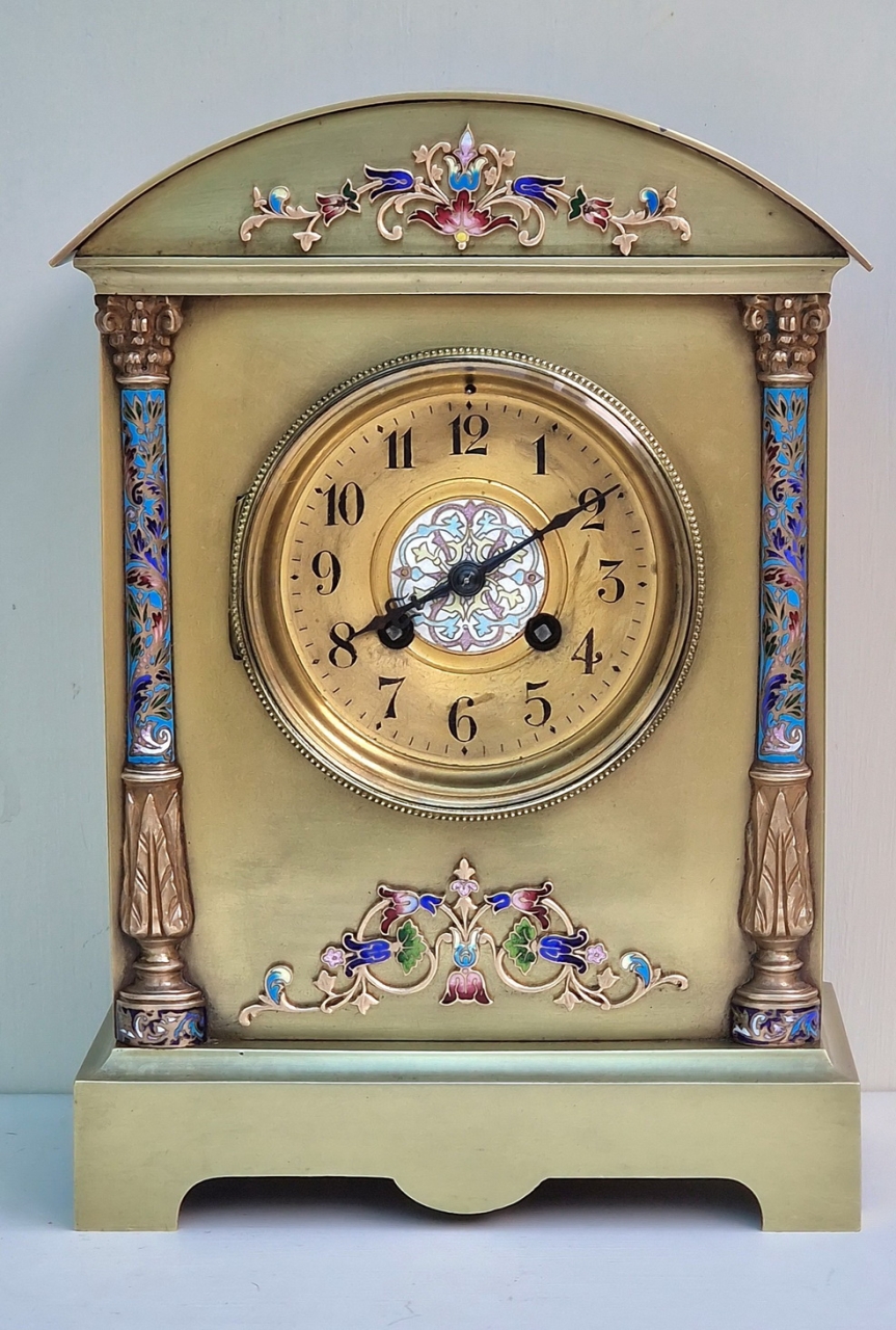 A French brass and gilded mantel clock. An arched pediment with a raised champleve panel. A gilded dial with blued steel hands and an enamel dial centre. Corinthian side columns with enamel decorations.