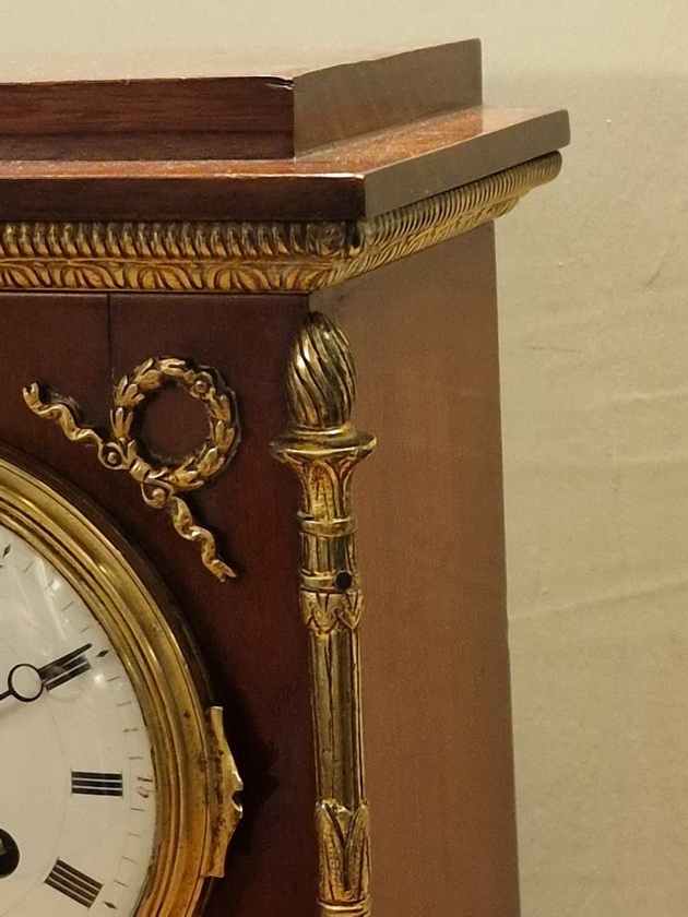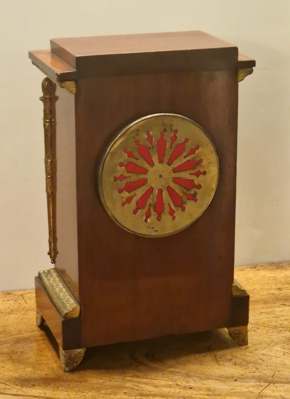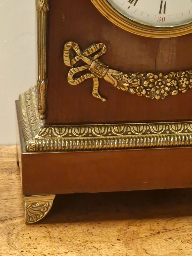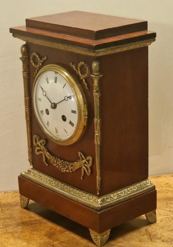 A quality French mantel clock in the Empire period style. A walnut case with gilded case mounts. Swags to the case front and tapered torches to the sides standing on decorative feet. An enamel dial with 'moon' blued steel hands and convex glass.