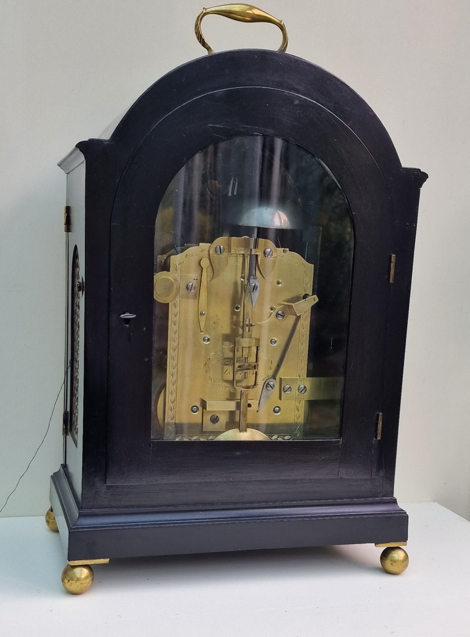 A Georgian twin fusee bracket/table clock. An elegant, ebonised arched top case of good proportions. The case front has brass edging to the dial and standing on brass ball feet. Brass fretwork to the case sides with silk backing. An arched painted dial signed 'HY. RUSSELL LONDON' with a strike/silent in the arch. A rarer feature of a third hand for the days of the month shown on the inner section from 1 to 31. A fine quality, twin fusee mechanism striking the hours on a bell. A beautifully engraved backplate to the mechanism signed Russell London within a cartouche. A pull repeat to the side. A glass back door showing the mechanism. The original pendulum transportation lock and a finer quality pendulum with accurate adjustments on the scale. Circa 1815.