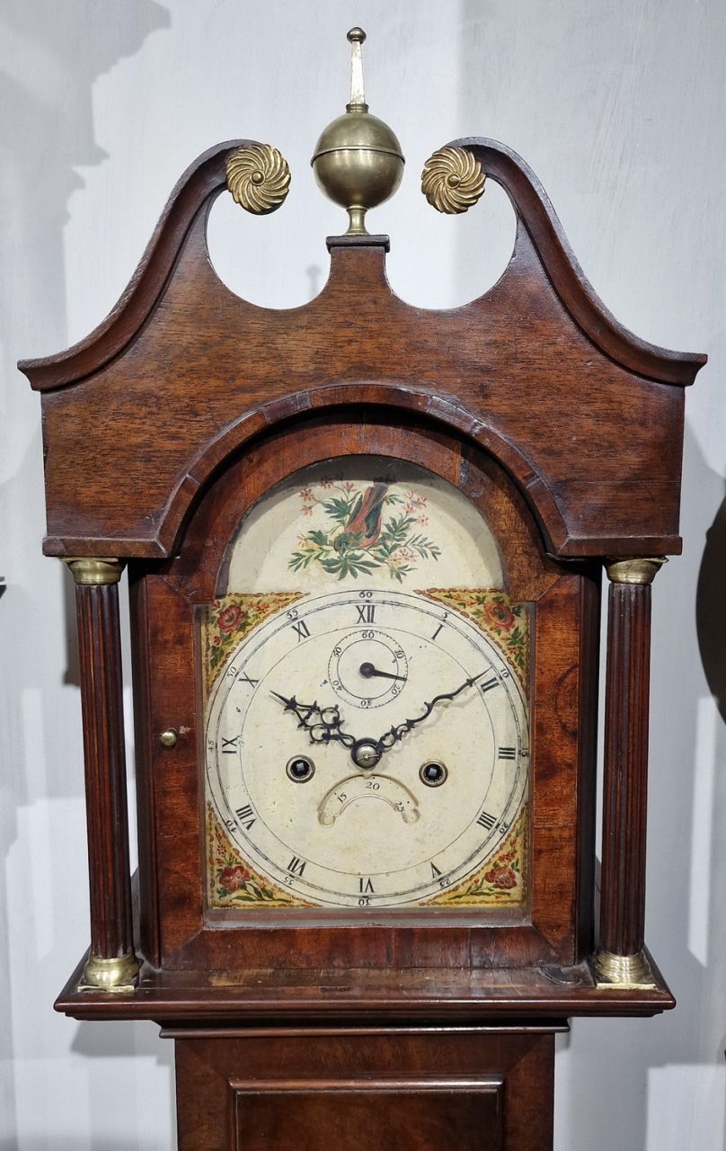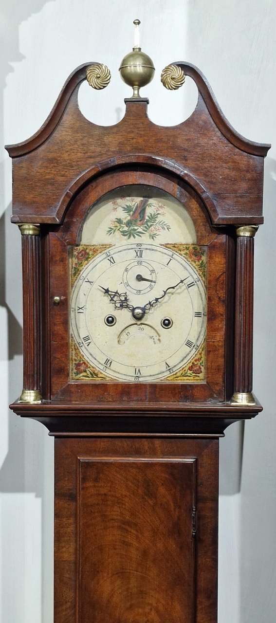 A genuine and rare Georgian period 'Grandmother' longcase clock. A swan neck hood pediment with central brass finial. Brass capped, fluted hood side columns. Crossbanding to the hood arch. A well proportioned mahogany case of good colour and small proportions. An attractive arched painted dial with corner floral gilt decorations with a date and seconds. A bird to the arch and blued steel hands.