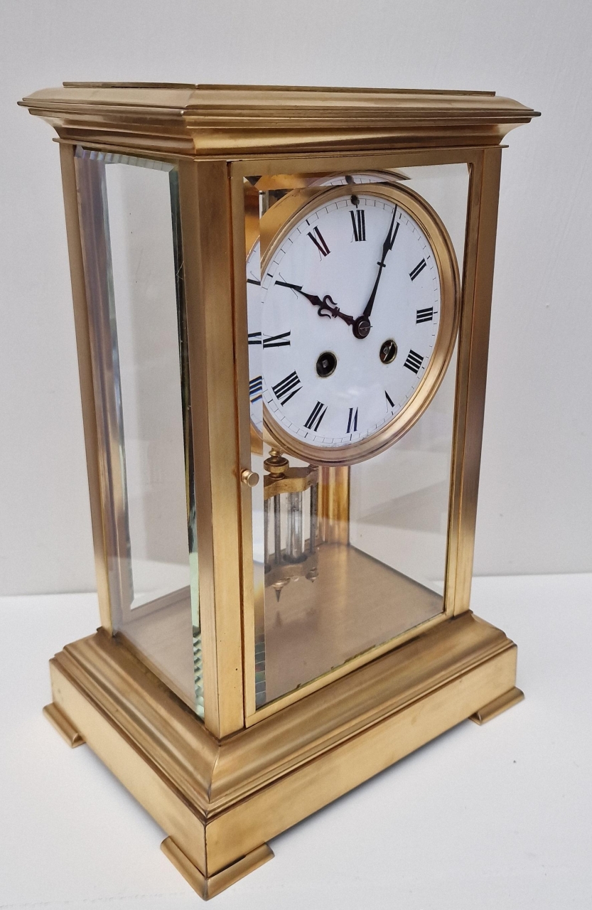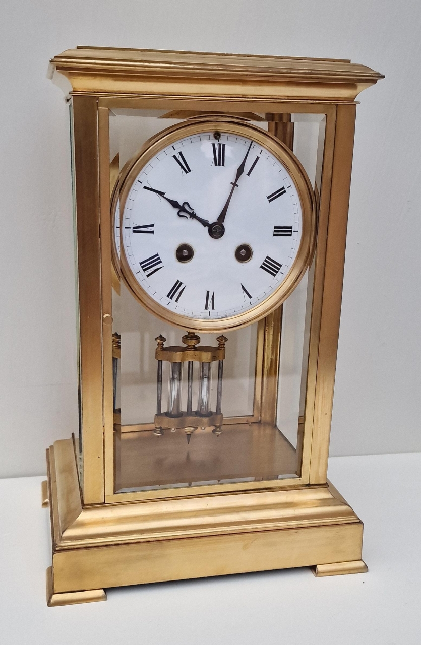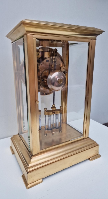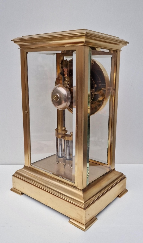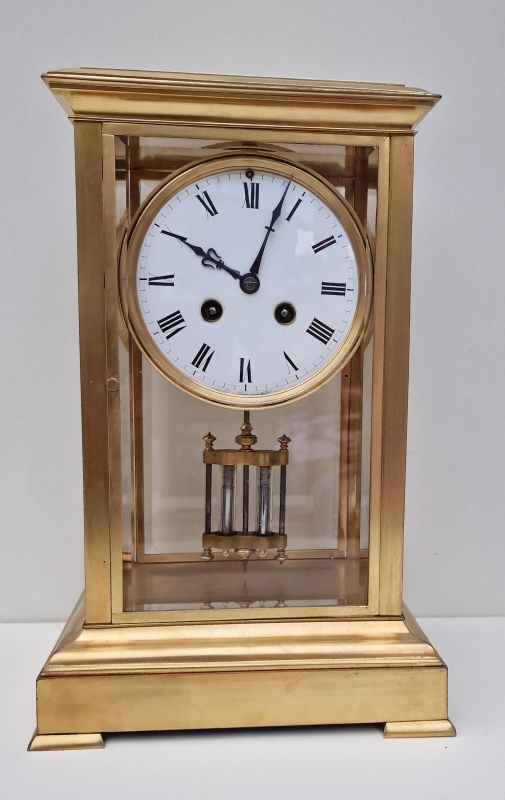 A French gilded four glass mantel clock. Bevelled glass panels with opening front and rear doors. The original case gilding in very good condition, a little wear to the top panel. An enamel dial with blued steel hands. A mercury compensating pendulum. An 8-day duration mechanism striking the 1/2 hours and hours on a bell. The mechanism is marked 'A.1 and 8408. Circa 1895.