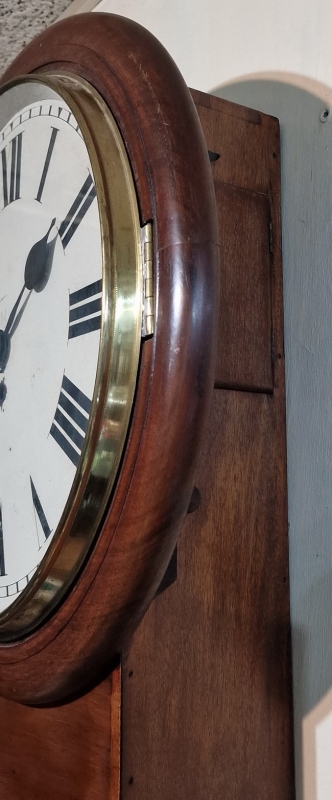 A larger 14" painted dial fusee wall clock. The dial is signed 'GvR' for King George 5th. Blued steel hands. A drop dial mahogany case with a brass bezel surround. An 8-day duration fusee timepiece mechanism. Circa 1910.