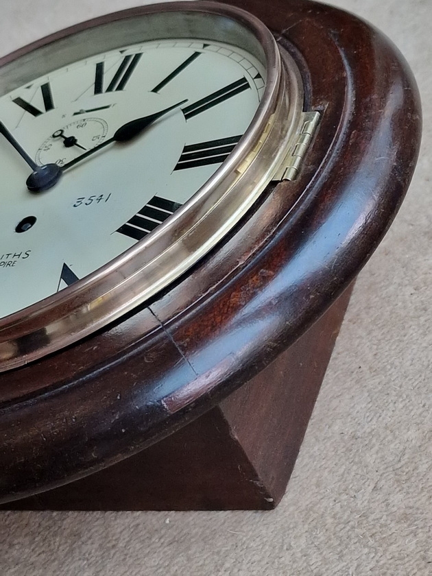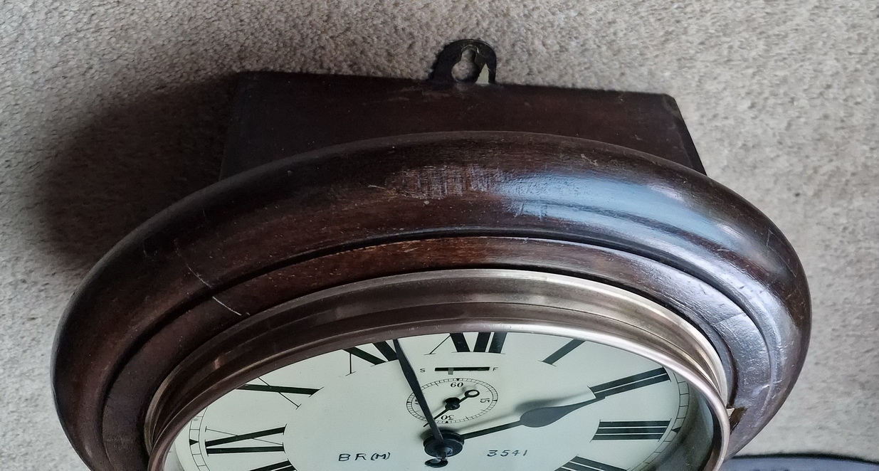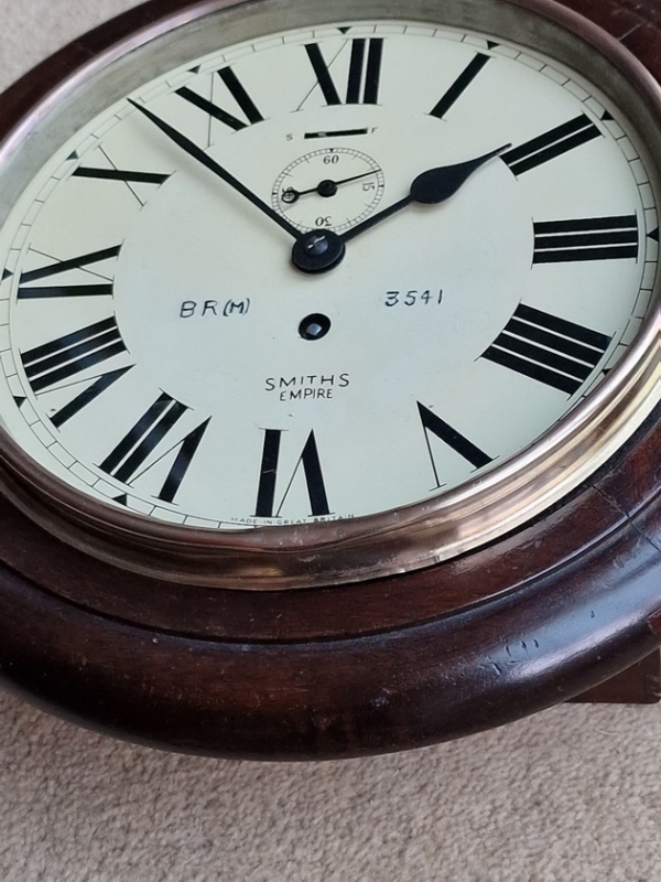 Smiths supplied the railways with 'station' clocks. This example is from British Railways Midlands region. There are indistinct 24 hour markers on the inside edge of the dial as often seen on railway use examples.