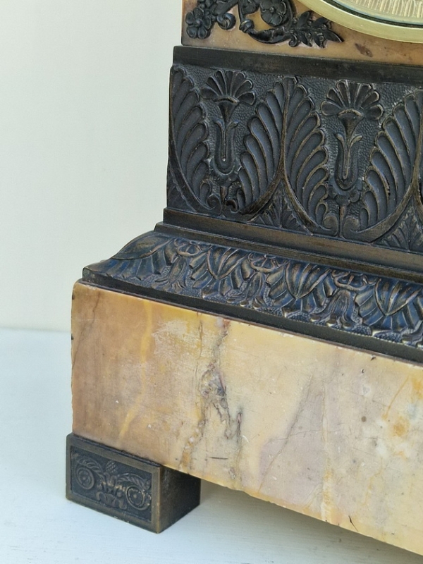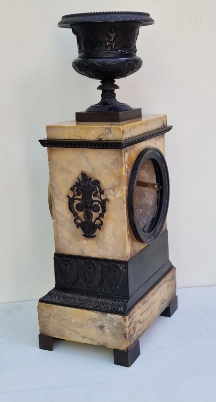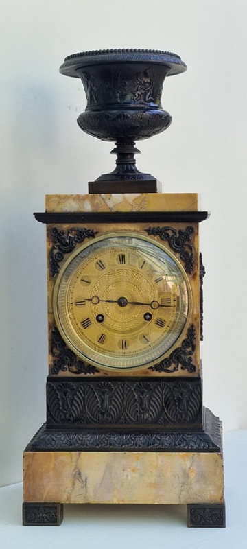 An early 19th century French Empire period mantle clock. A Sienna marble case with lovely grain. Bronze raised panels and corner spandrels around the dial. A finely detailed bronze urn set to the top. A gilt engine turned dial with circles around the Roman numerals. Blued steel "moon" hands. An 8-day duration silk suspension mechanism striking the half hours and hours on a bell. Circa. 1815.