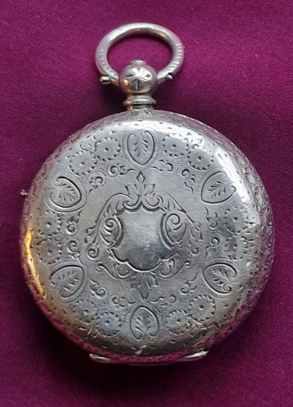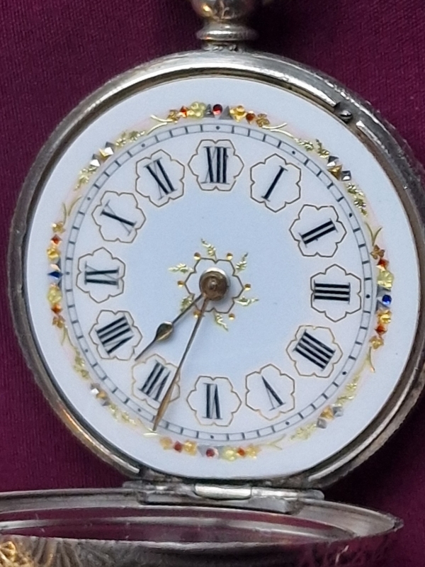 A Swiss silver pocket watch. A lovely enamel dial with multicoloured decorations and blued steel hands. Engraving to the case back and sides. A key wind mechanism. Circa 1895.