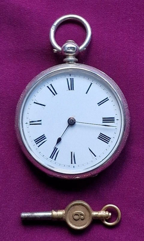 A Swiss silver pocket watch. An enamel dial with blued steel hands. Engraving to the case back and sides. A key wind mechanism. Birmingham hallmarks for 1882.