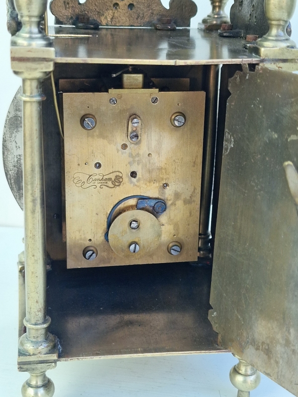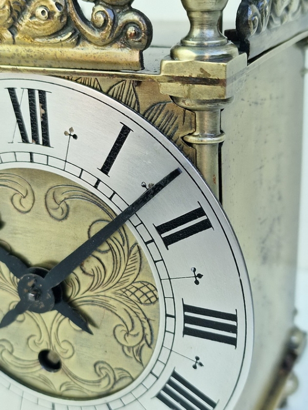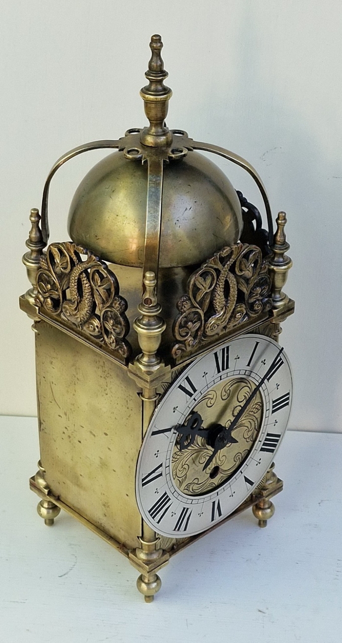 A nice quality, small English lantern clock. A brass case with engraving to the centre with blued steel hands. Engraved top fretwork panels and the dial surround. A carriage clock type mechanism with a platform escapement of 8-day duration. Passing hourly strike to the bell. Signed 'Canham of London' to the mechanism. Circa 1950.