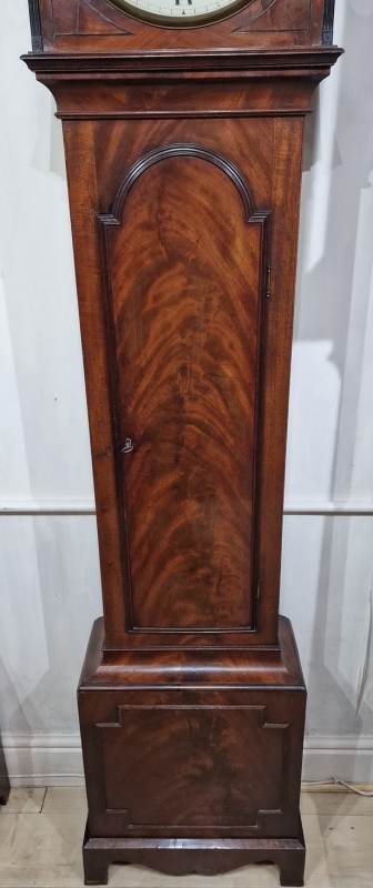 A small proportioned Regency mahogany regulator longcase clock. A slim case with an arched pediment surmounted by 3 gilded ball finials. Choice flame mahogany case veneers. Ebonised line inlays to the hood with fluted small side mouldings. A re-entrant base panel moulding as often seen on London area cases. A convex glass to the cast brass bezel. A circular painted dial with blued steel hands. A seconds dial and signed 'John Addison Guildford'. A fine quality 8-day duration mechanism striking the hours on a bell. It has a dead-beat escapement with maintaining power. Brass cased weights and a very heavy pendulum bob with a wooden rod as seen on most regulators. Circa 1825.