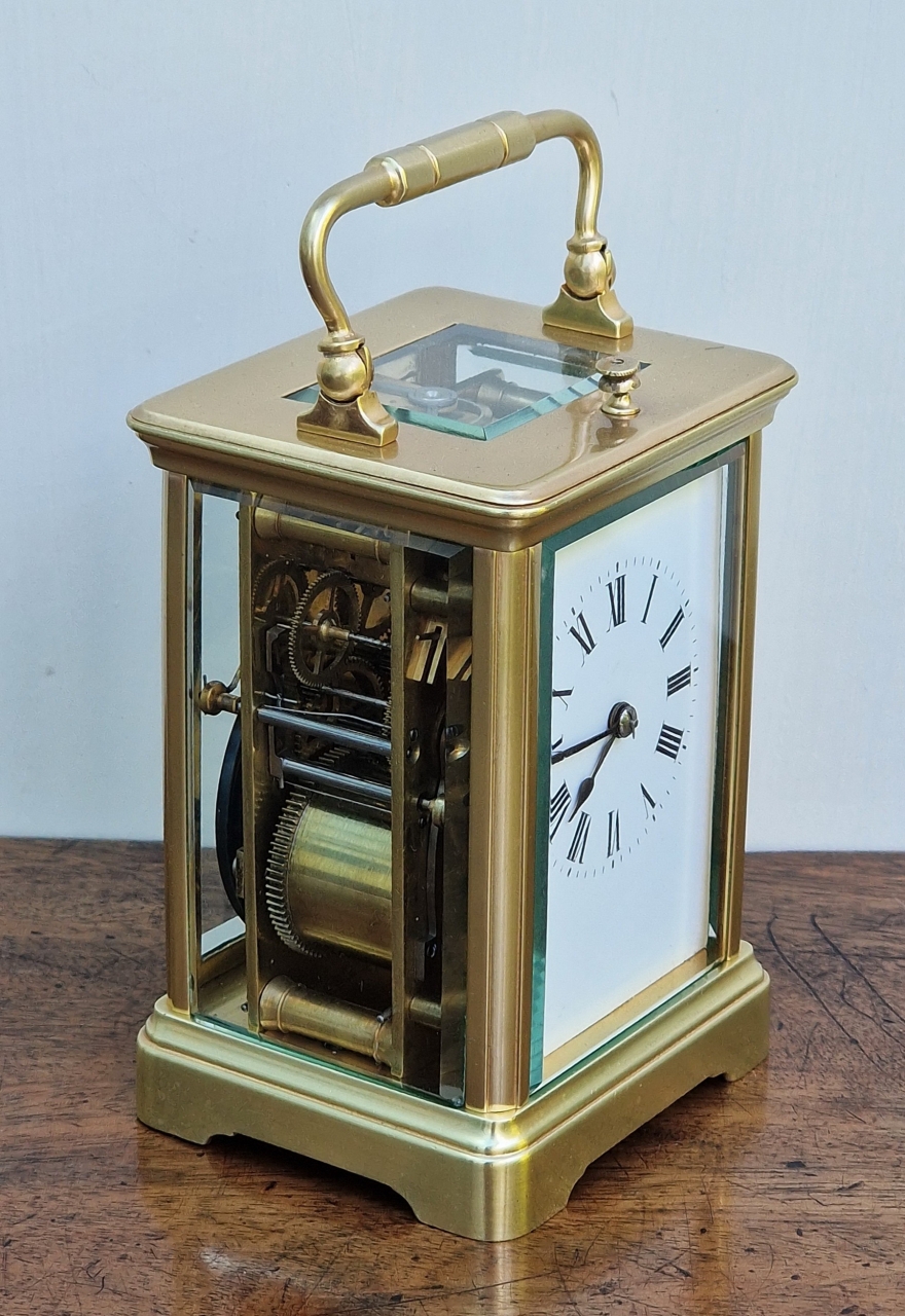A French brass cased striking & repeating carriage clock. An enamel dial with Roman numerals and blued steel hands. An 8-day duration mechanism striking the hours and 1/2 hours on a gong. A lever escapement visible through the oblong top glass. A push button top repeating. Circa 1895.