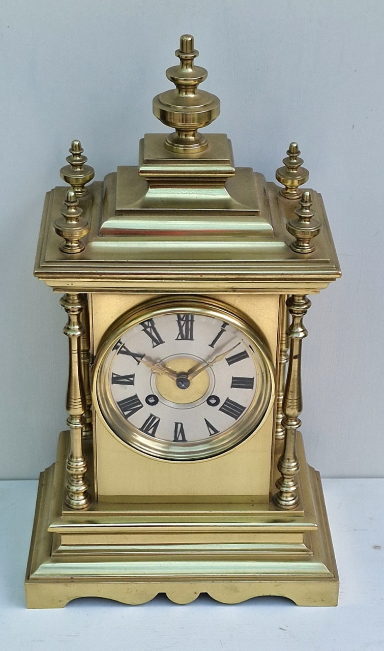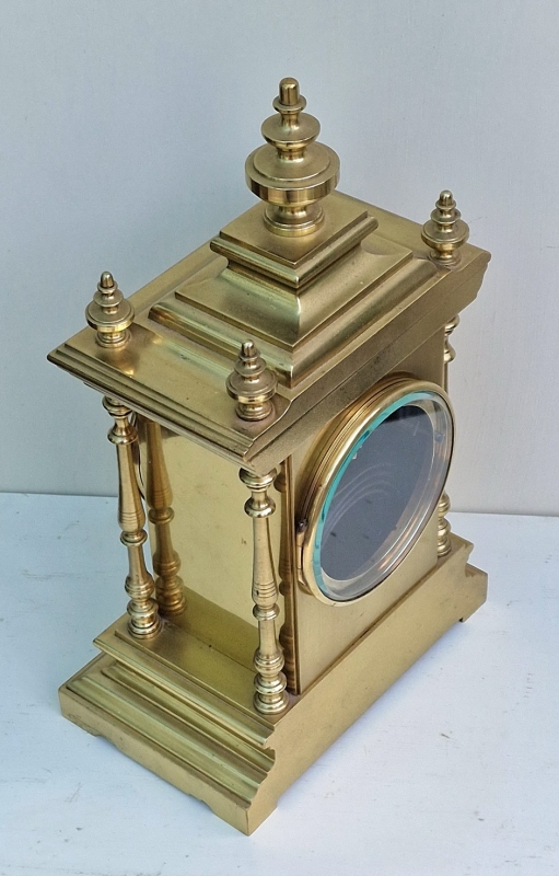 A good quality Victorian French mantel clock. A brass case with a stepped pediment surmounted by finials. Turned side columns and a stepped base plinth. A silvered dial with a gilt centre and gilt brass hands. A glass back door.