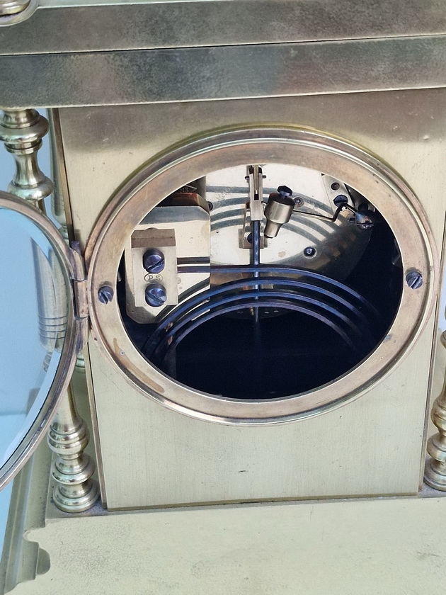 An 8-day duration mechanism striking the 1/2 hours and hours on a gong by Marti of Paris. Circa 1895.